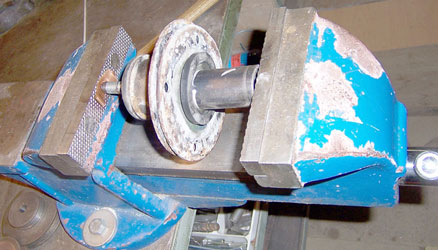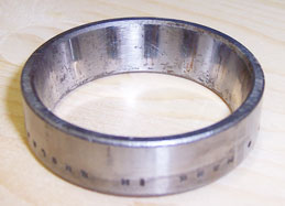 Zum Einpressen der neuen Außenringe verwende ich einen originalen Einschlagstempel von DAF (nicht für diesen Zweck vorgesehen, aber verwendbar). Da er sehr breit ist, geht das zunächst nur bündig. Für den weiteren Einpressvorgang habe ich einen alten Außenring rundherum am Schleifbock etwas abgeschliffen, sodass er von Hand in die Lagerbohrung eingeführt und auch wieder herausgezogen werden kann. Im rechten Bild ist zu sehen, wie der so im Außendurchmesser reduzierte Hilfsring dazu dient, den neuen Lageraußenring einzupressen (Klicken zum Vergrößern). Der weitere Einbau muss streng nach Werkstätten-Handbuch erfolgen !