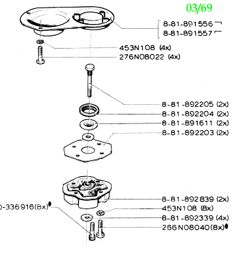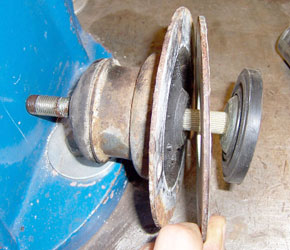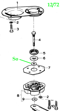 In der Ausgabe 12/1972 gibt es den Aufhängeblock nur zusammen mit der unteren Scheibe Nr. 9 (892 339) unter einer kombinierten Ersatzteilnummer. Gemeint ist hier vermutlich der Aufhängeklotz 225 712, der in meinen Onderdelenboekjes nicht einzeln erwähnt wird. Die untere Scheibe gehört meines Erachtens jedoch ausschließlich zu der niedrigeren Ausführung 892 839, damit diese ungefähr die gleiche Bauhöhe erreicht wie 225 712. Die obere Scheibe So (siehe Bild) konnte ich bei keinem der von mir untersuchten Aufhängeblöcke nachweisen. Wer weiß hier Genaueres? Zum Zerlegen spannt man die gebrauchten Aufhängeblöcke in einen großen Schraubstock ein. Der Kopf des Schraubenbolzens wird in ein Rohrstück gepresst.