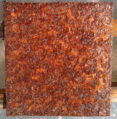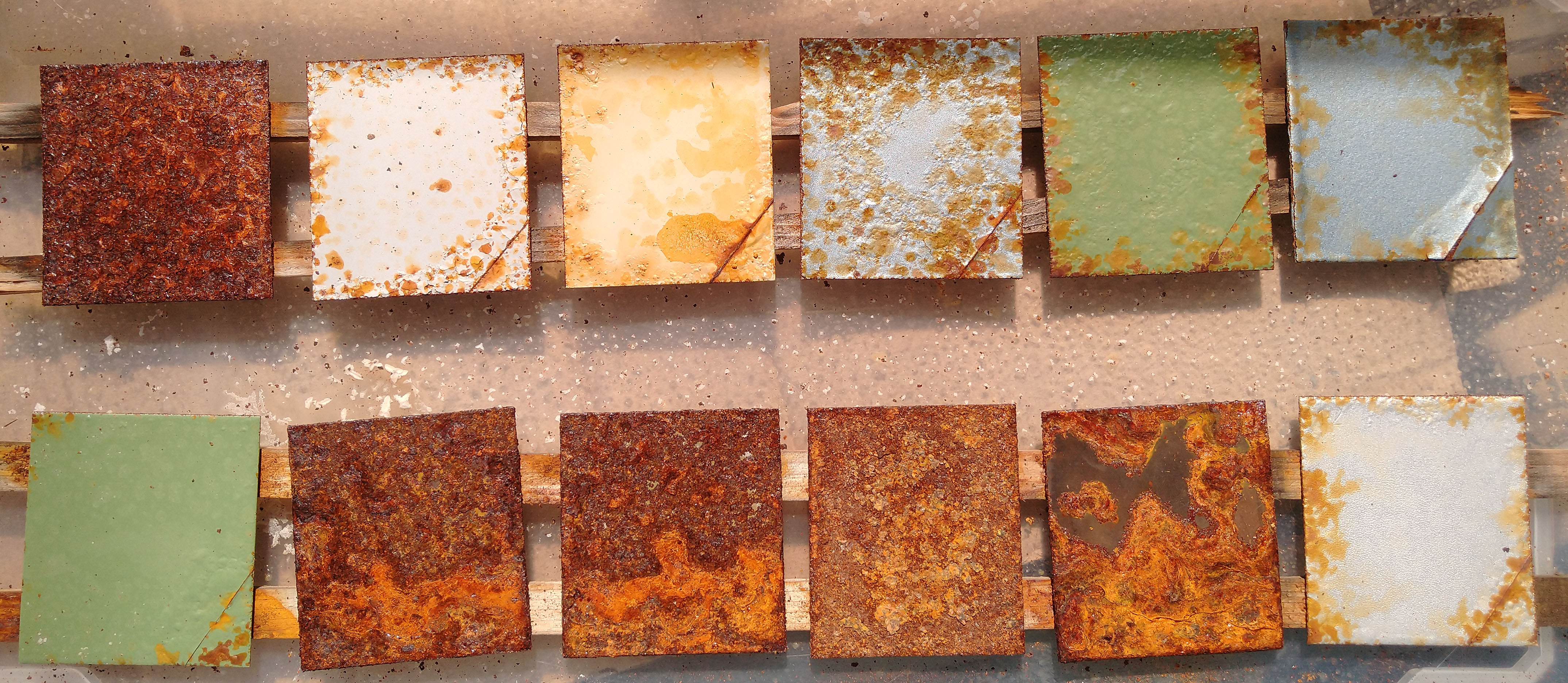 6. Stand nach 12 MonatenEs ist Anfang Oktober, die Bleche haben nun ein Jahr lang Zeit gehabt, um standesgemäß Rost anzusetzen (Bild ist anklickbar): Hier die Ergebnisse im Einzelnen: #1 Unbehandeltes Referenzblech: