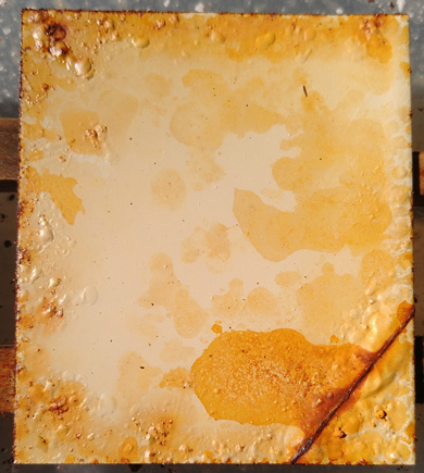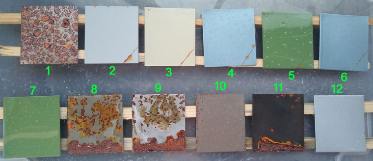 Das unbehandelte Referenzblech #1 weist zu diesem Zeitpunkt die wüstesten Korrosionsschäden auf. Es folgen auf den hinteren Plätzen die zwei in Säure gebeizten Bleche #8 und #9. Irgendwelche nennenswerten Unterschiede zwischen der Phosphor- und der wesentlich billigeren Salzsäure vermag ich nicht zu erkennen. Ich schließe daraus, dass beim Entrosten mit Phosphorsäure nicht automatisch eine schützende Phosphatschicht entsteht. Rust Prevention Magic mit der Startnummer #10 wird vom Rand her kommend angeknabbert. Merkwürdigerweise haben sich schwarze Inseln von der Oberfläche abgelöst!? Alle anderen Bleche sehen zu diesem Zeitpunkt noch recht gut aus. Die von dem Einschnitt ausgehenden Rostschlieren wie sie z.B. bei der 2K-Epoxy-Grundierung #3 zu sehen sind, dürfen nicht überbewertet werden. Vielleicht werde ich diese oberflächlichen Verschmutzungen vor dem nächsten Phototermin abwischen. Interessanter ist, wie weit die Beschichtung rechts und links vom Einschnitt durch Unterrostung emporgedrückt wird. Dies fällt beispielsweise bei der #6 1K-Spraydosen-Grundierung mit 1K-Spraydosen-Lack deutlich auf. Am besten steht zu diesem Zeitpunkt augenscheinlich die #7 2K-Epoxy-Grundierung + 2K-VOC-Acryllack da. |