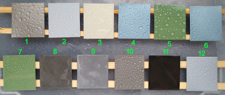 An den Blechen, auf denen das Wasser nicht abperlt, sondern verläuft, sieht man, dass der Boden der Kiste nicht vollständig eben ist, sodass die Feuchtigkeit auf diesen Blechen nach unten läuft und dort für starke Korrosion sorgt. Diese Unebenheit ist zwar so gering, dass man sie mit bloßem Auge gar nicht wahrnimmt, aber im Rostbild kommt sie eben deutlich zum Vorschein. Betroffen sind nur die mit Säure gebeizten Bleche #8 und #9 sowie das brünierte Blech #11. Die Bleche, auf denen das Wasser abperlt, sind von diesem Problem nicht betroffen, erstaunlicherweise auch nicht das vollständig unbehandelte Referenzblech #1. Dieses wurde zwar - genau wie alle anderen Bleche - nach dem Ausschneiden mit der Blechschere mit Verdünnung abgewischt, aber offensichtlich sorgt die sehr glatte Oberfläche für einen wasserabweisenden Effekt, der bei den gebeizten oder brünierten Blechen verlorenging. Das brünierte Blech #11 schneidet etwas besser ab als die gebeizten Bleche, was zeigt, dass die Brünierung doch einen leichten Rostschutz bewirkt. Das zeigt sich auch, wenn man den Brüniervorgang in siedender Brünierlauge aus irgendeinem Grund vorzeitig beendet: die bereits vollständig schwarzen Teile überstehen das anschließende Wasserbad völlig unbeschadet, die zu diesem Zeitpunkt erst leicht ergrauten Teile setzen hingegen neuen Flugrost an.