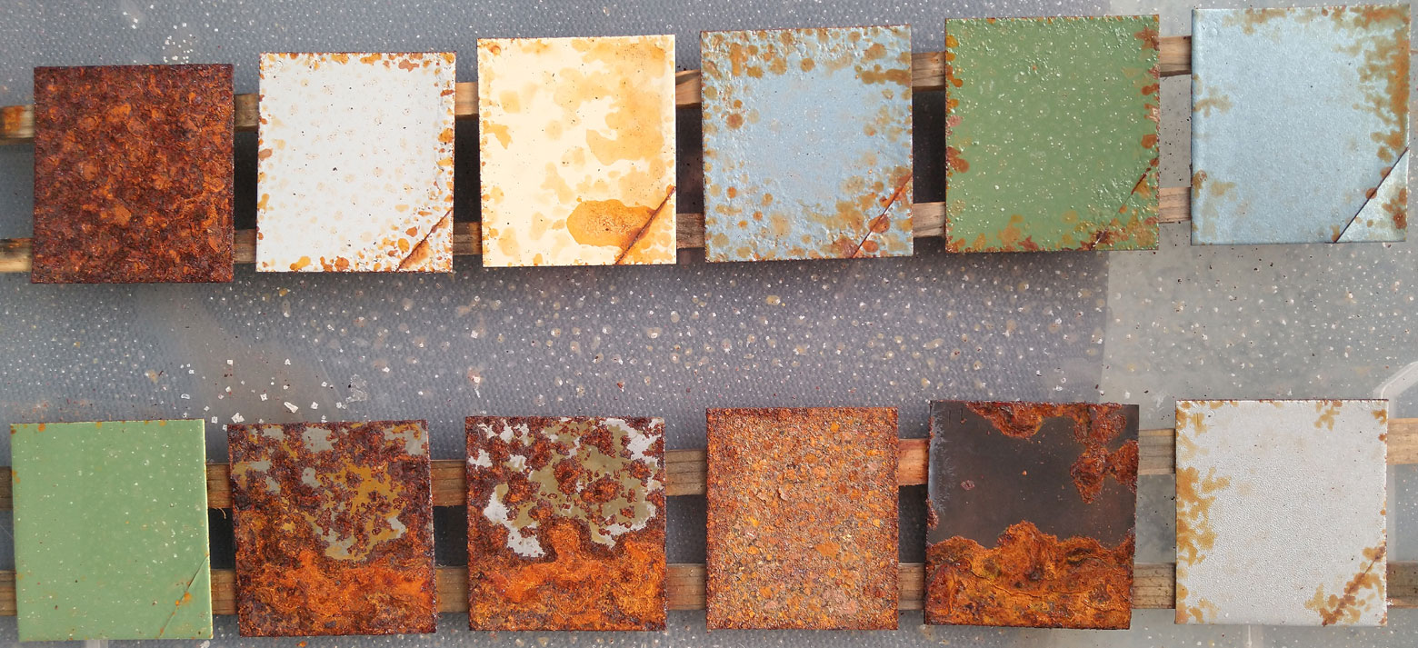 2. Durchführung und BesonderheitenTestaufbau und -durchführung entsprechen dem bewährten Vorgehen bei den bisherigen Tests. Im Unterschied zu den bisherigen Tests bekamen jedoch alle beschichteten Bleche unten rechts einen Schnitt mit dem Cuttermesser verpasst, um eine definierte Beschädigung der Schutzschicht zu simulieren. Gute Produkte sollten in diesem Bereich weniger stark von Unterrostung betroffen sein!