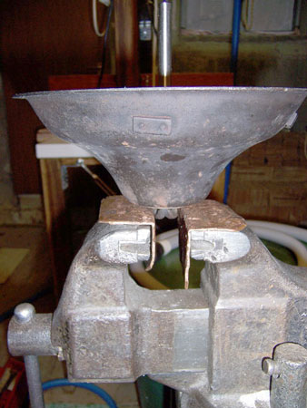 2.) Den Deckel auf einem Schraubstock mit Kupferbacken abstützen und