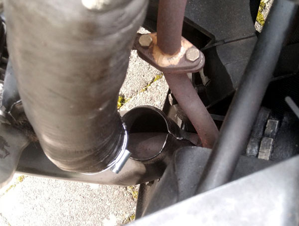 Leider sind die heutzutage erhältlichen Gewebeschläuche so eng toleriert, dass sie sich oft nur mühsam auf die Flansche aufschieben lassen. Und wenn so ein Schlauch dann einmal nicht richtig sitzt und sich während der Fahrt löst, führt dies zu zusätzlichen Geräuschen, wenn die Schlauchschelle gegen den Heizkrümmer schlägt: